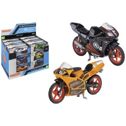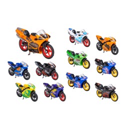 Závodná motorka 1:24. Tieto vozidlá zvládnu každý terén. Do detailov prepracovaný model terénnej motorky s pohyblivými časťami a gumenými kolesami oslovia každého malého chlapca a bude mu poskytovať veľa hodín zábavy. Je ideálnou pre malých pretekárov.Svoju zbierku si môžete vylepšiť ..