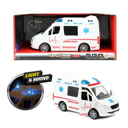 Počujete sirény? Toto záchranárske auto je biele so značením ambulancia a ostatných znakov sanitiek a má naťahovací motor. Hneď ako auto potiahnete dozadu a pustíte, rozbehne sa. Na vrchu je tlačidlo, pomocou ktorého môžete jednoducho zapnúť sirény a blikajúce svetlá. Dajú sa otvoriť aj bočné ..