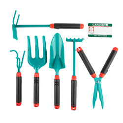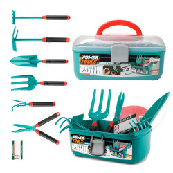 Záhradné náradie pre deti v kufríku 6 kusov - v plastovom kufríku s rukoväťou možno použiť na hranie alebo naozaj na záhradu s lopatkou, hrabľami, nožnicami, motyčkou vytrhávačom buriny, hrabľami na kyprenie a ďalšími náradiami.Špecifikácia:1 Záhradné náradie v úložnom kufríku 6 ksodolný plast..